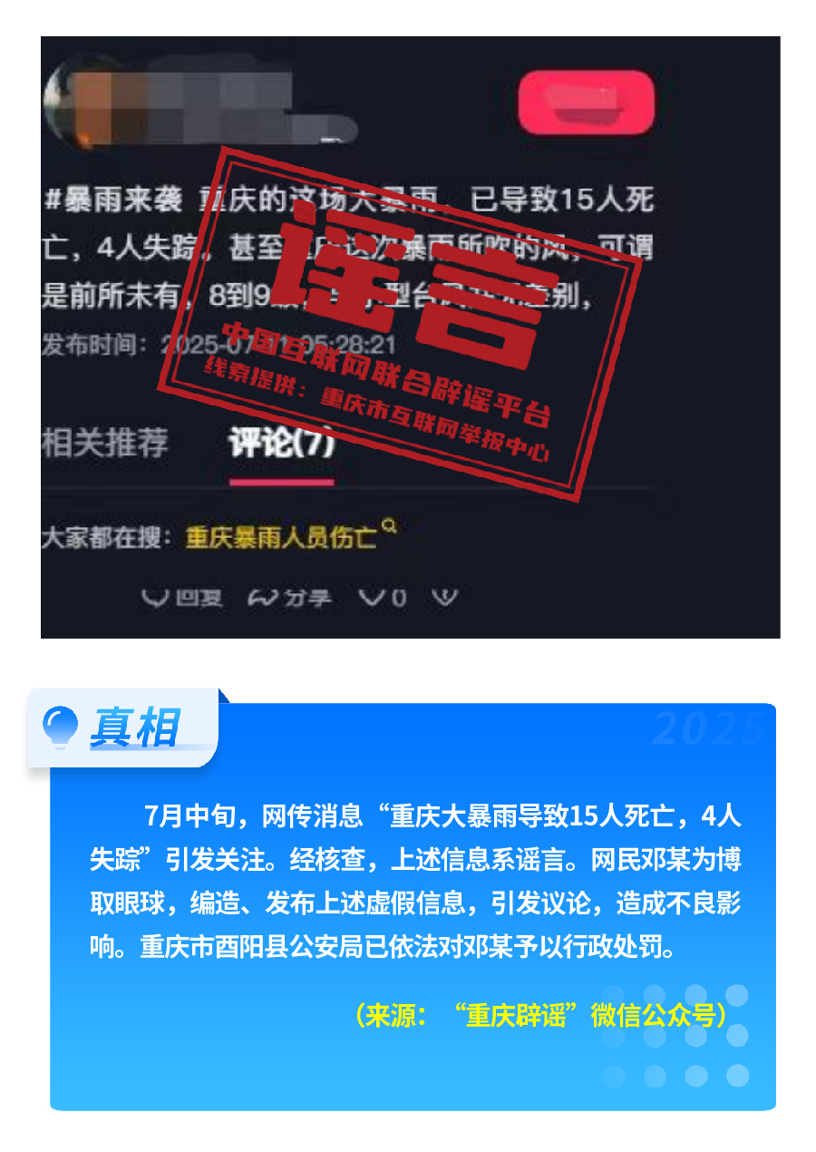 近期,網(wǎng)上接連出現(xiàn)發(fā)布虛假“警情通報”的惡性造謠傳謠案件,炮制傳播“昆明駕車撞人案131人死亡”“杭州自來水接入糞水”及涉釋永信虛假“警情通報”,模仿“藍底白字”格式,杜撰聳人聽聞細節(jié),損害政府公信力,嚴(yán)重擾亂社會秩序?!霸菏款A(yù)測廣東將發(fā)生8級以上大地震”公然偽造專家聊天截圖,謊報地震預(yù)警。還有造謠者借盛夏高溫酷暑與洪澇災(zāi)害,編造“安徽淮北、山東泰安等地多人因高溫死亡” “重慶大暴雨導(dǎo)致15人死亡、4人失蹤”等謠言,蹭炒熱點、煽動情緒。