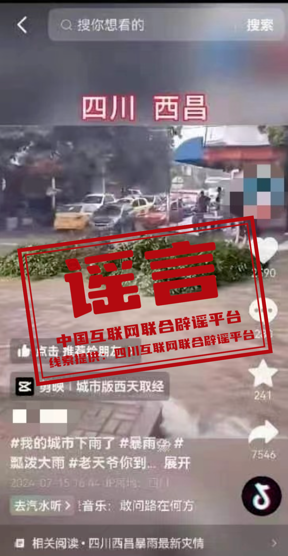 近日,有網(wǎng)民發(fā)布一條視頻,顯示兩人利用被吹斷的大樹枝在街道上乘汛漂流,并在視頻上方標(biāo)注了“四川西昌”的字樣,引發(fā)網(wǎng)民關(guān)注。經(jīng)調(diào)查,該視頻系網(wǎng)民蔡某為博眼球、吸流量,利用短視頻編輯軟件上的模板剪輯而成,并在短視頻平臺(tái)進(jìn)行傳播,造成不良社會(huì)影響。當(dāng)?shù)毓矙C(jī)關(guān)依法對(duì)其進(jìn)行處罰,并已責(zé)令其刪除謠言信息。(來(lái)源:四川互聯(lián)網(wǎng)舉報(bào)辟謠平臺(tái))