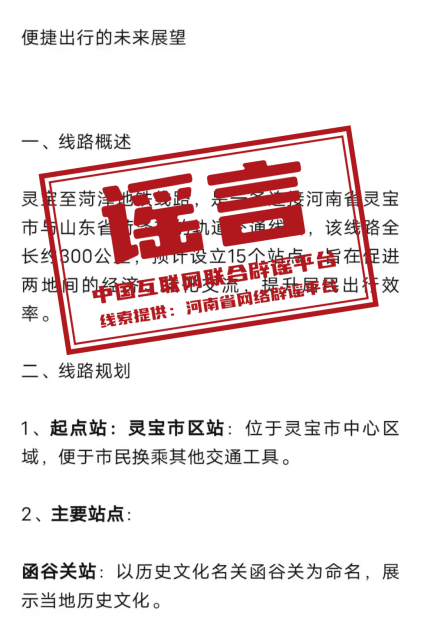 真相:近日,有自媒體賬號在互聯(lián)網(wǎng)平臺發(fā)布“靈寶到菏澤的地鐵”相關(guān)信息,稱“該線路全長約300公里,預(yù)計(jì)設(shè)立15個站點(diǎn)”“起點(diǎn)站為靈寶市區(qū)站,位于靈寶市中心區(qū)域”,引發(fā)關(guān)注。經(jīng)核實(shí),該消息系虛假信息?;ヂ?lián)網(wǎng)不是法外之地,請自覺遵守法律法規(guī),不造謠、不信謠、不傳謠。(來源:“清朗河南”微信公眾號、網(wǎng)信靈寶)